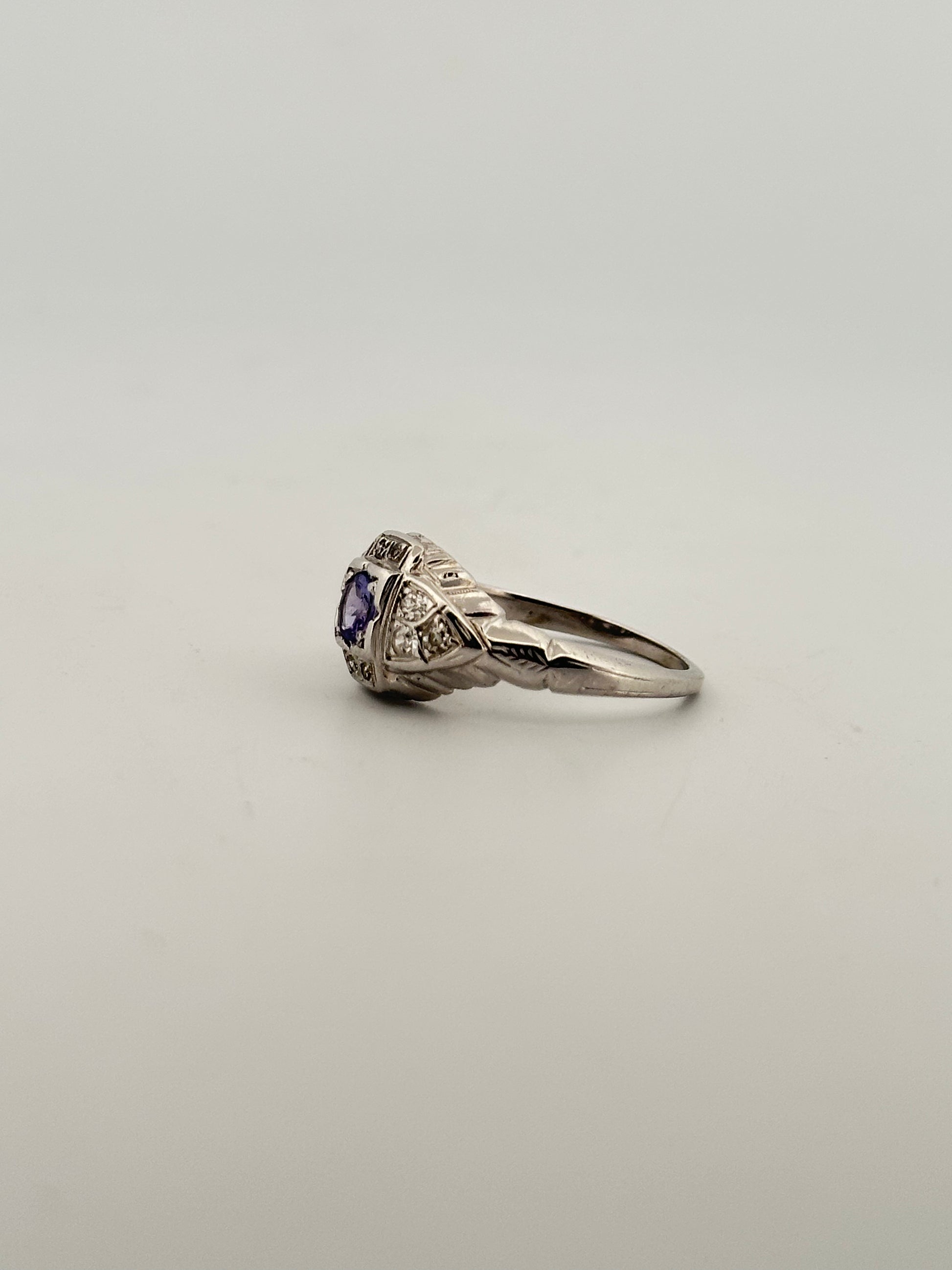 Antique art deco white gold ring with antique old mine cut diamonds and a .30ct (approximately) natural tanzanite center stone.