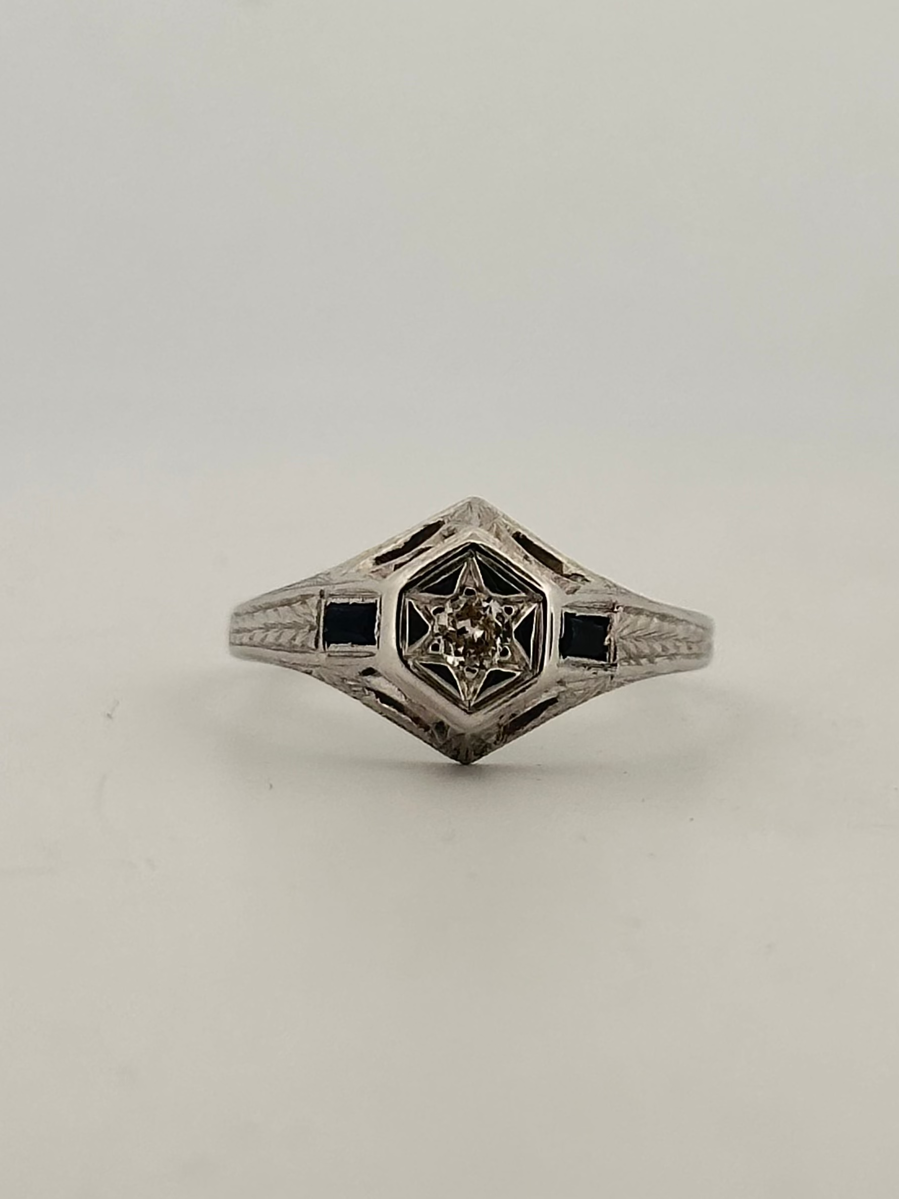 Antique art deco diamond solitaire with sapphire accents in 18k white gold