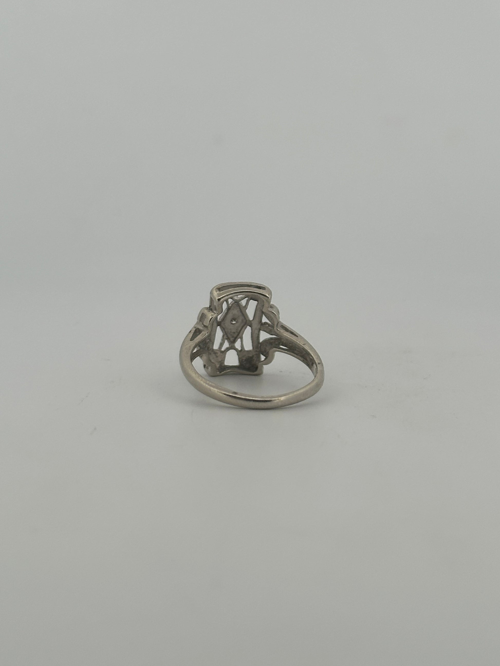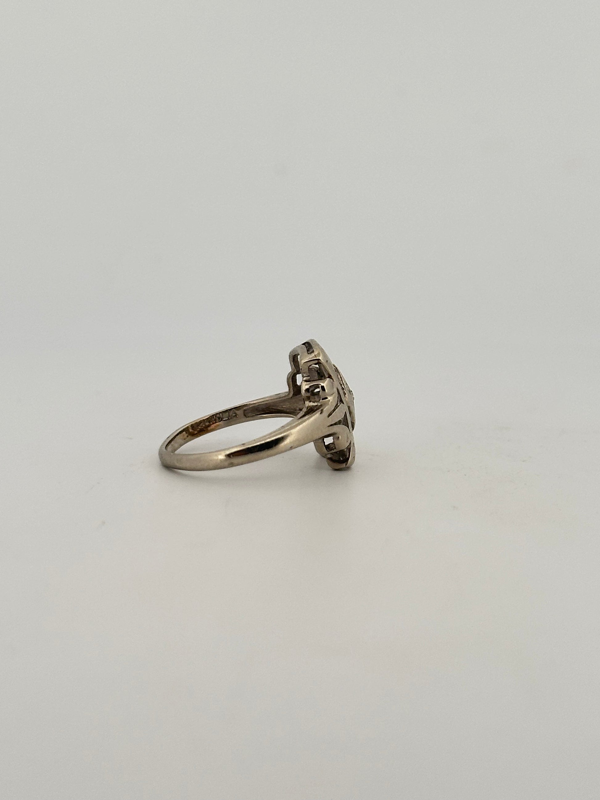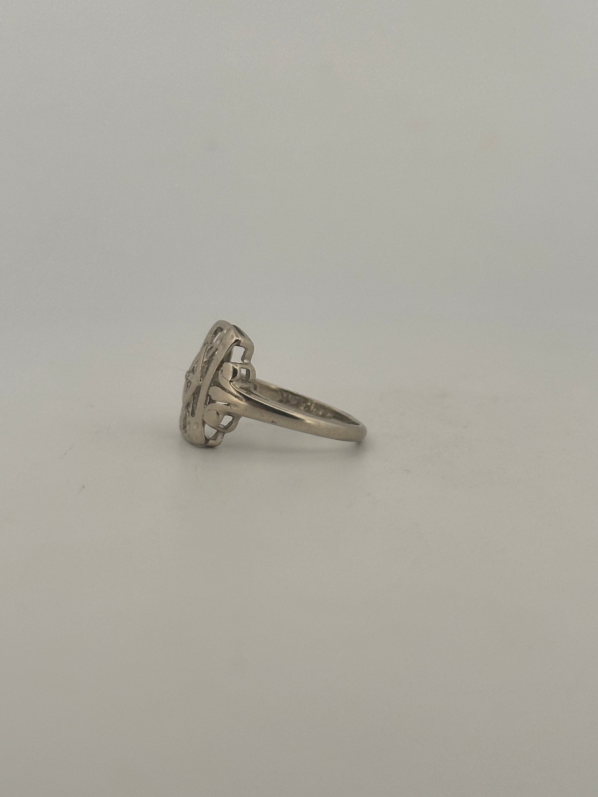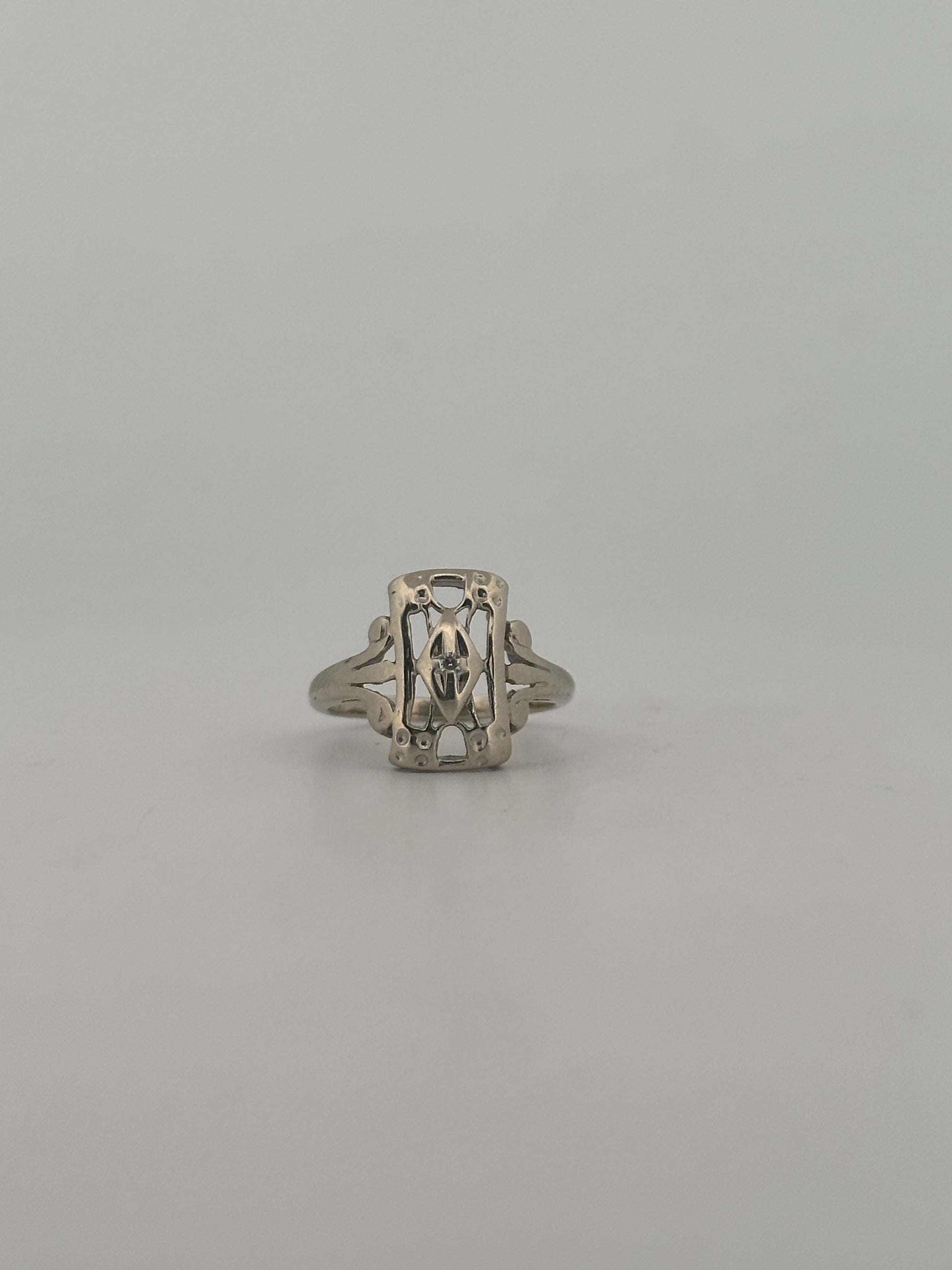 Antique art deco shield ring in 10k white gold with .02ct single cut diamond and stunning hand engraved filigree detailing.