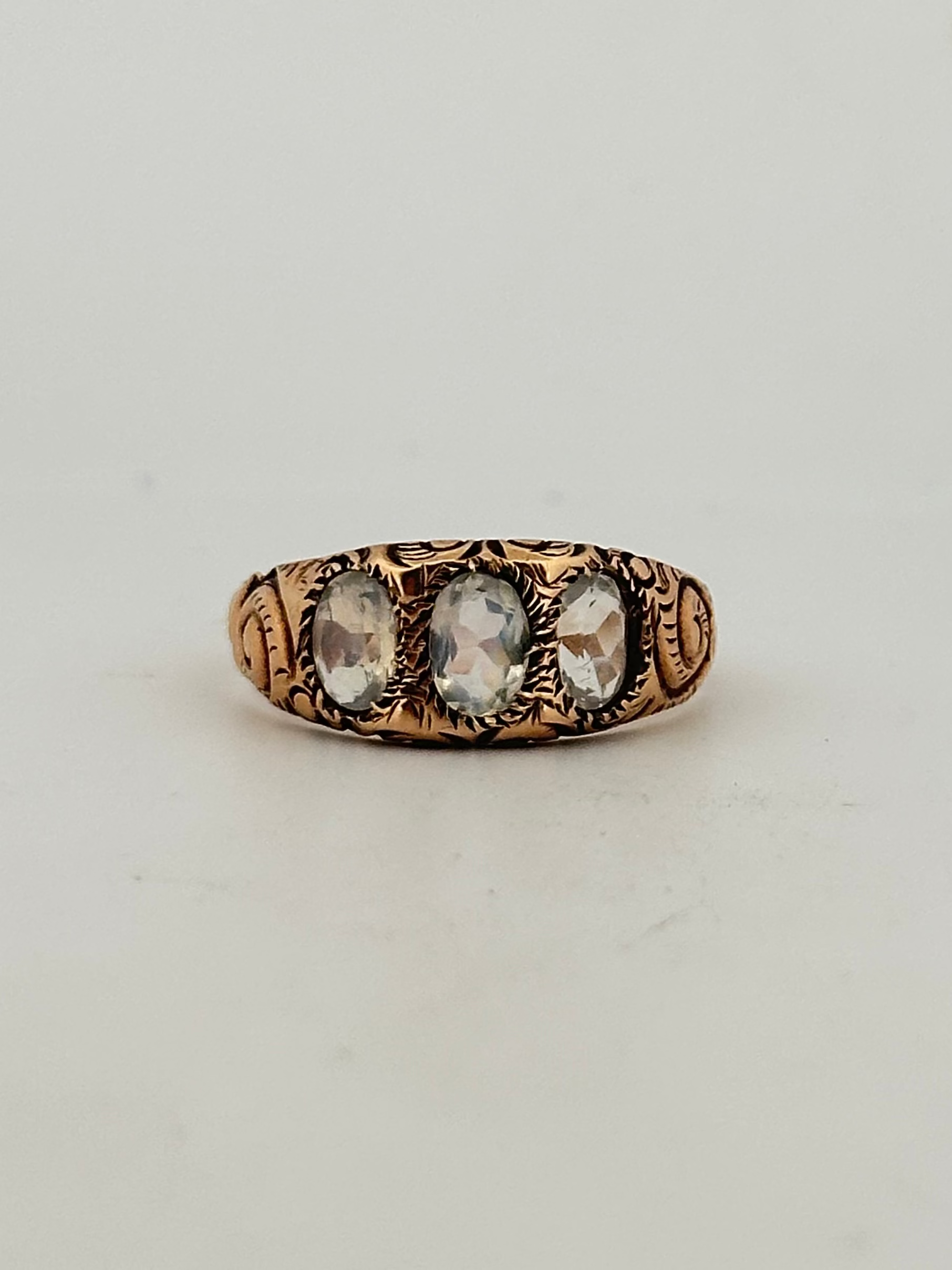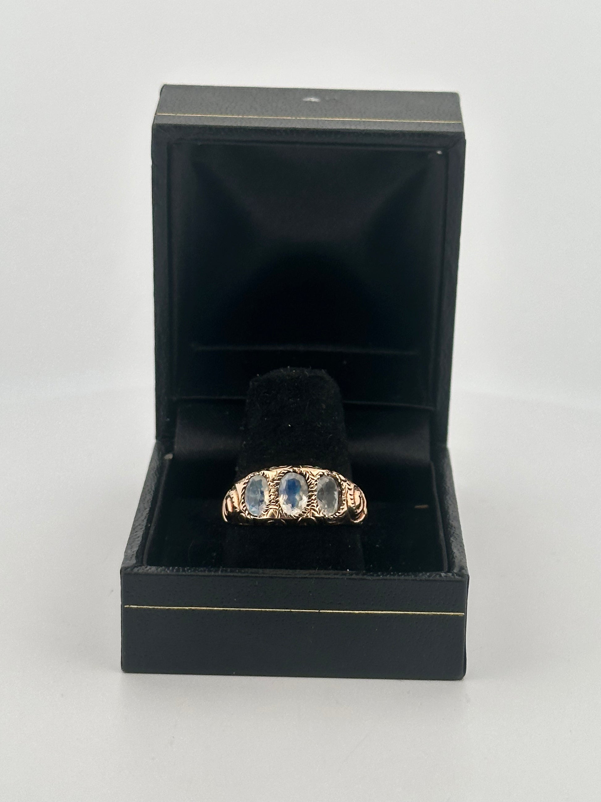 Antique Victorian faceted rainbow moonstone ring with stunning hand engraved detail in 10k yellow gold