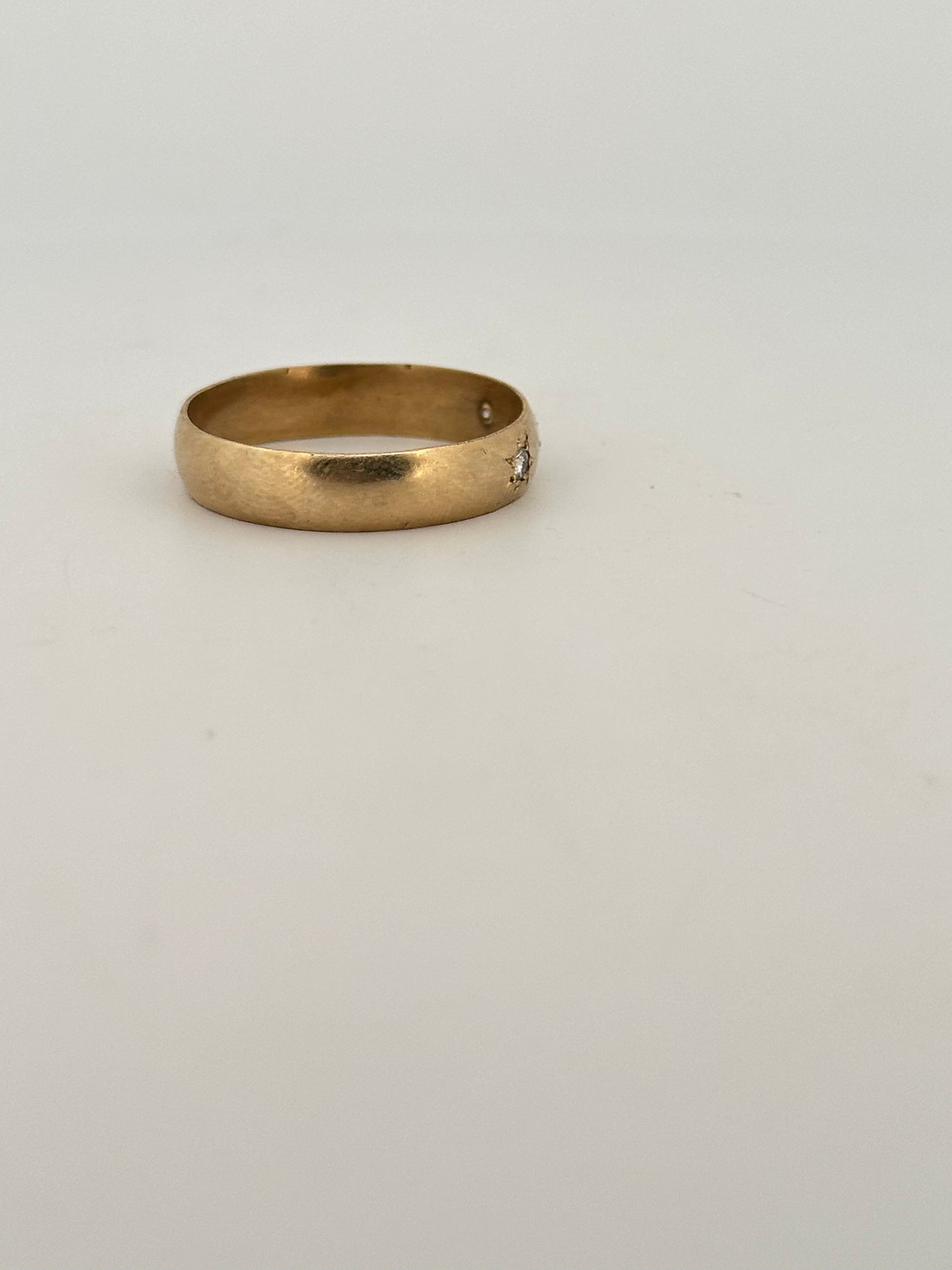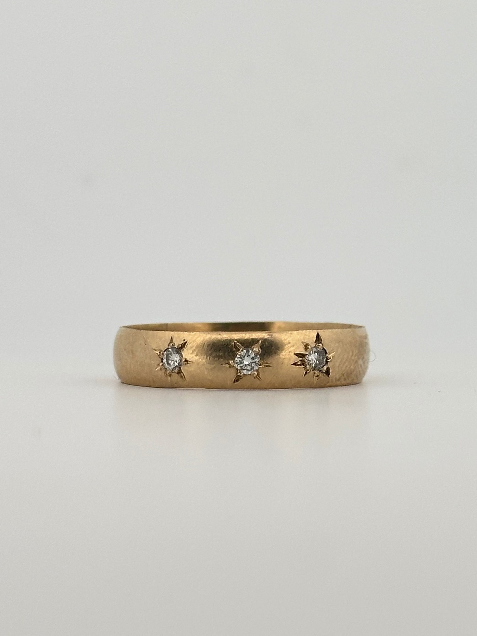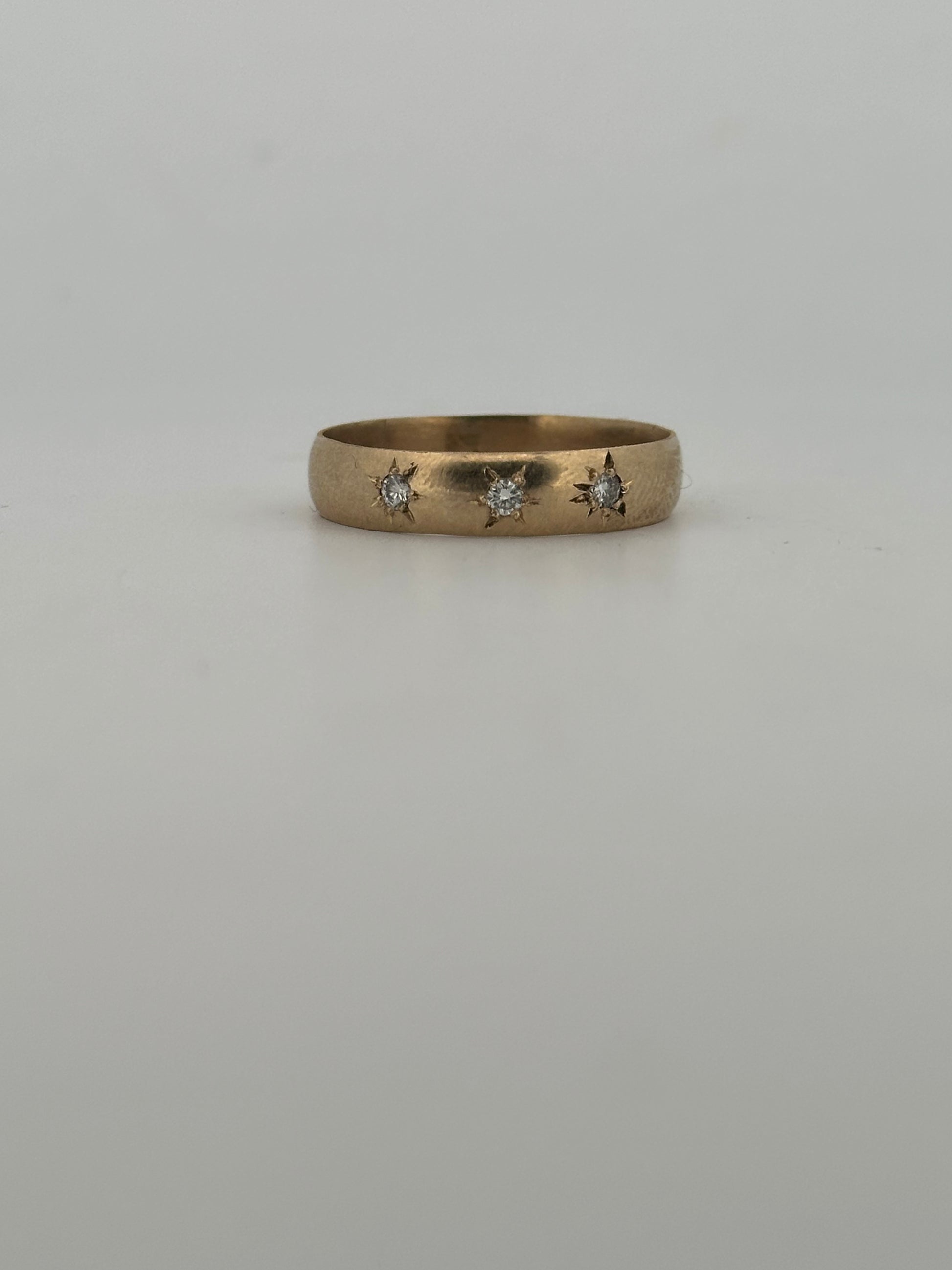 Antique Victorian Gypsy ring featuring three .10ct natural diamonds with hand engraved star design in a 14k yellow gold band