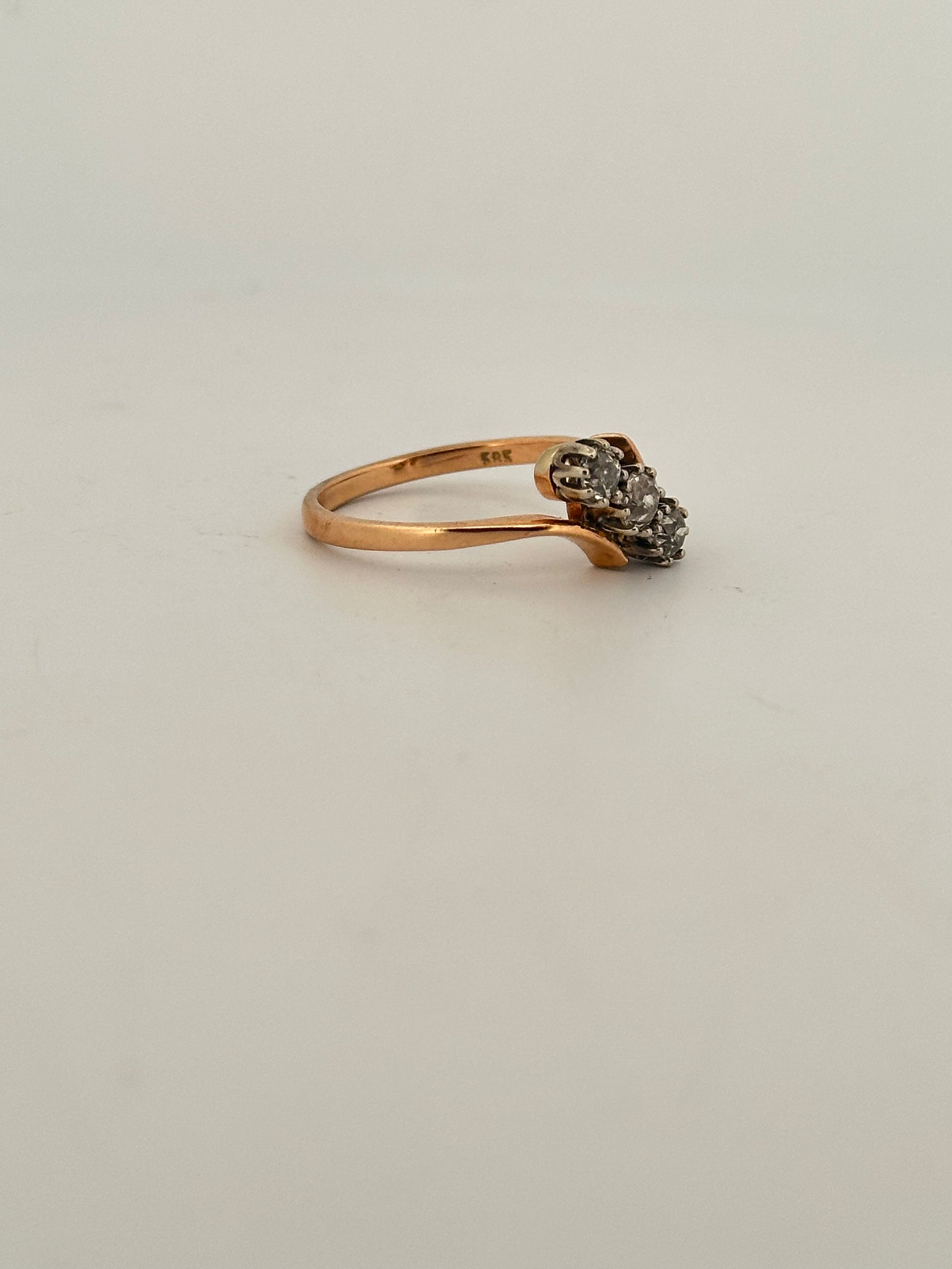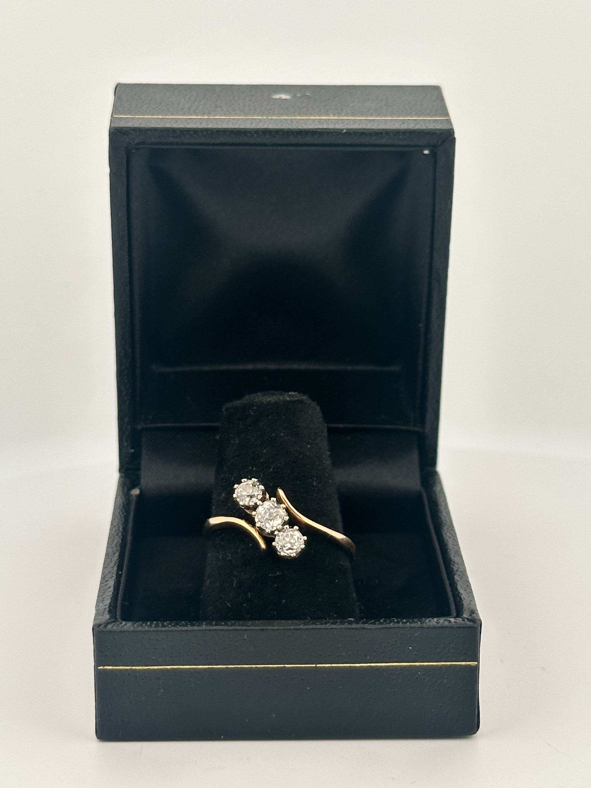 Antique Victorian ring in 14k yellow gold featuring three approximately .30ct each natural old mine cut diamonds