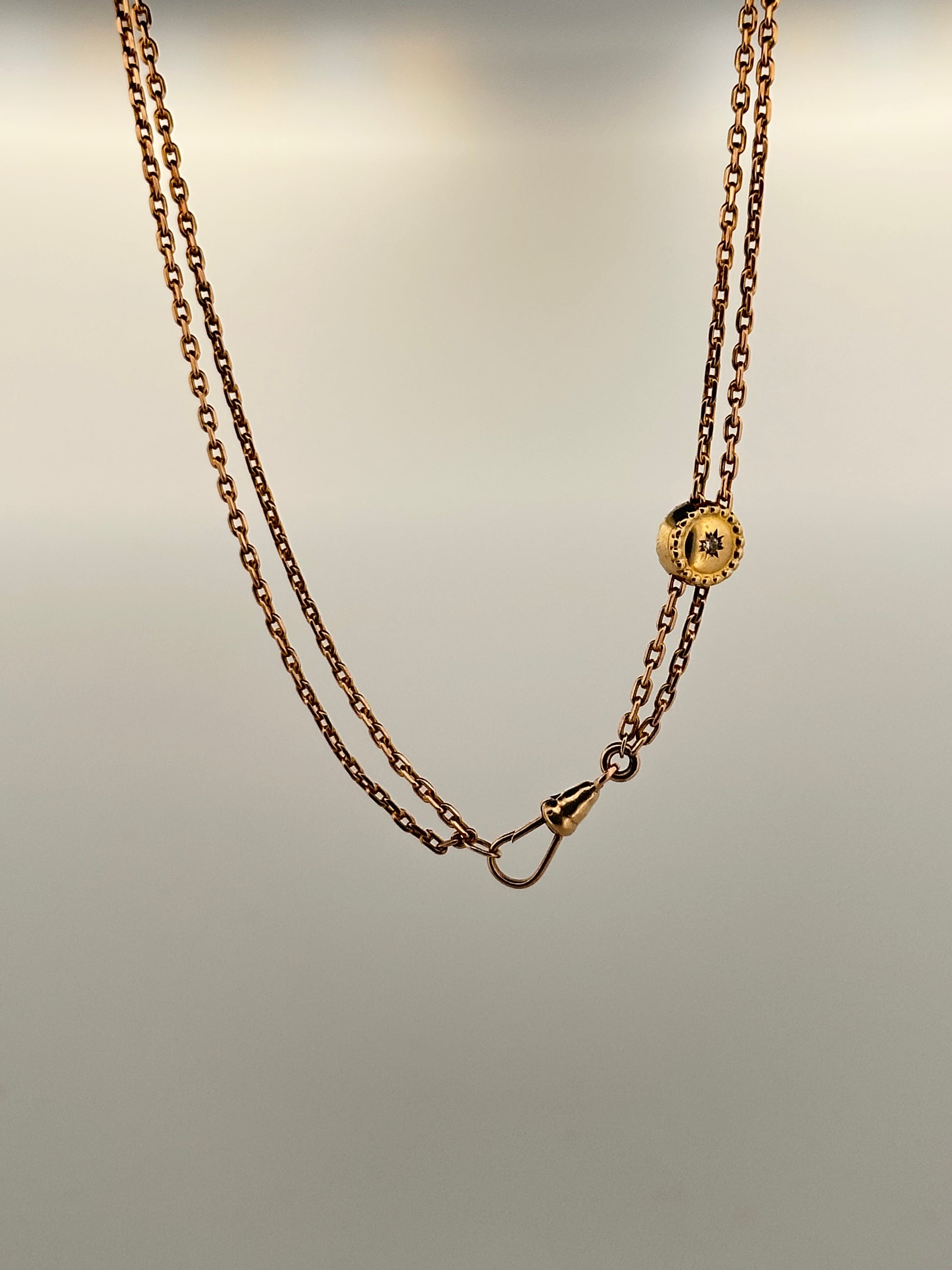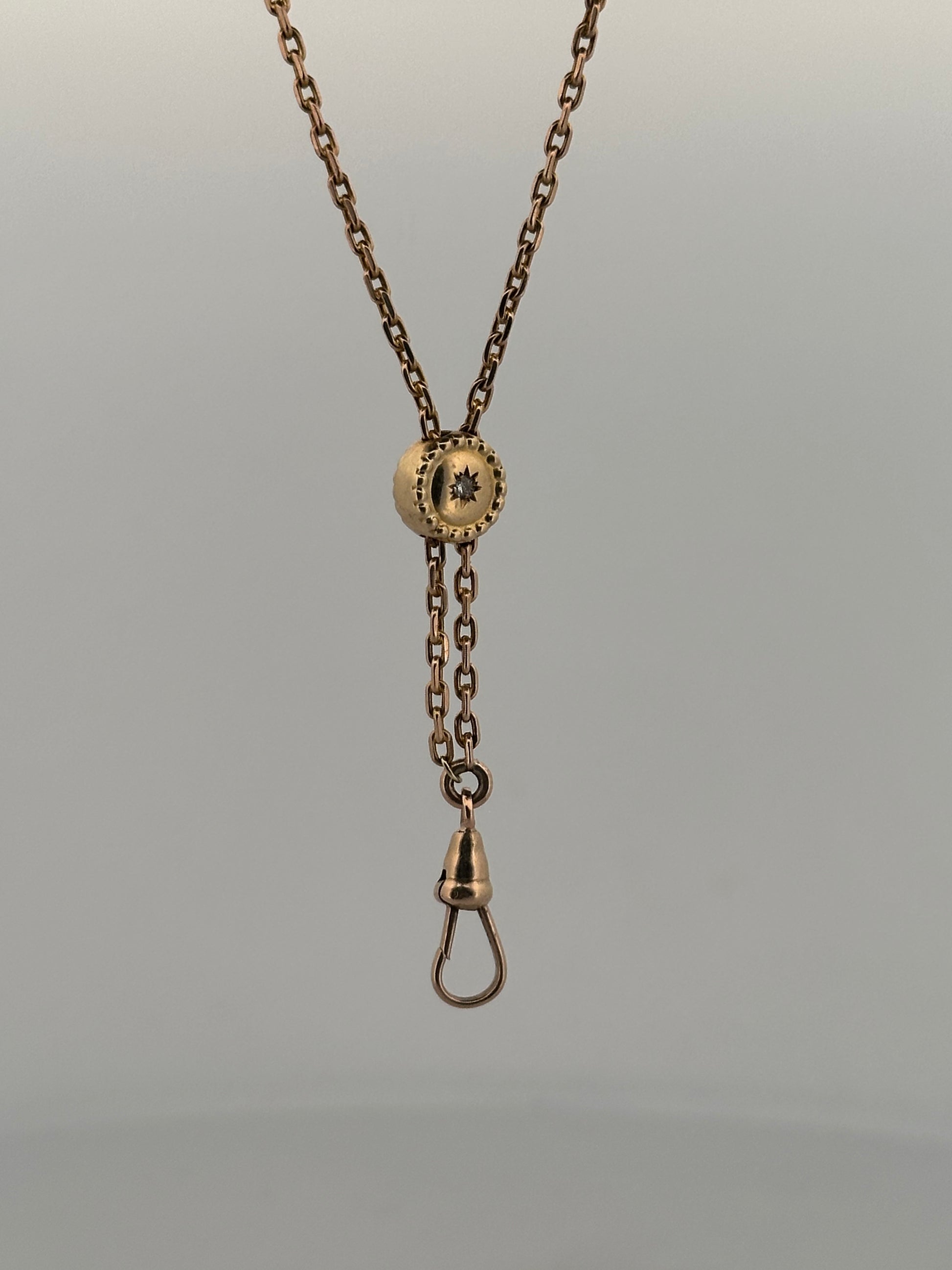Antique Victorian 10k yellow gold watch chain with slider with natural diamond with star set detail. Chain can be worn at full length (30”) or doubled (15”)