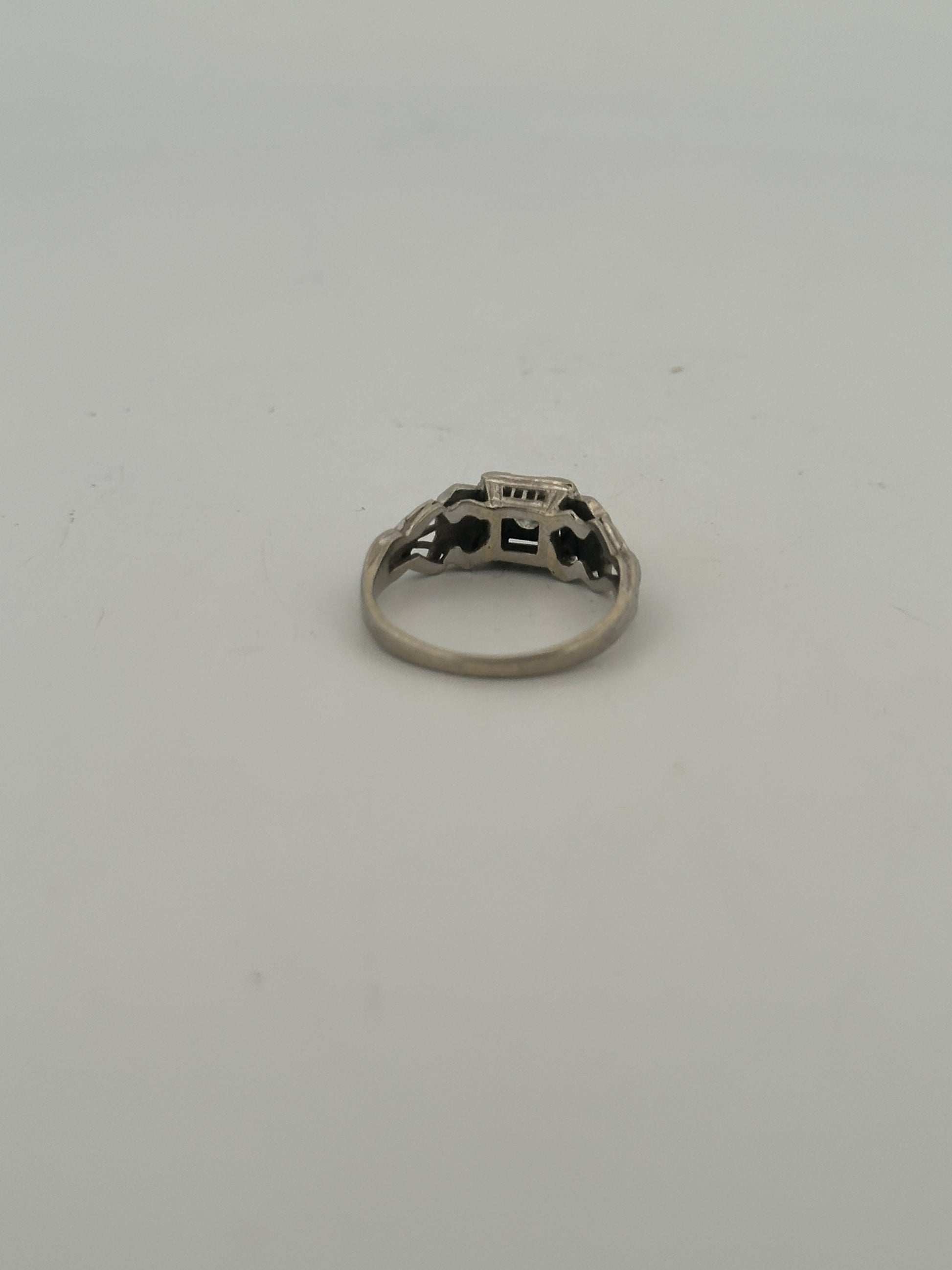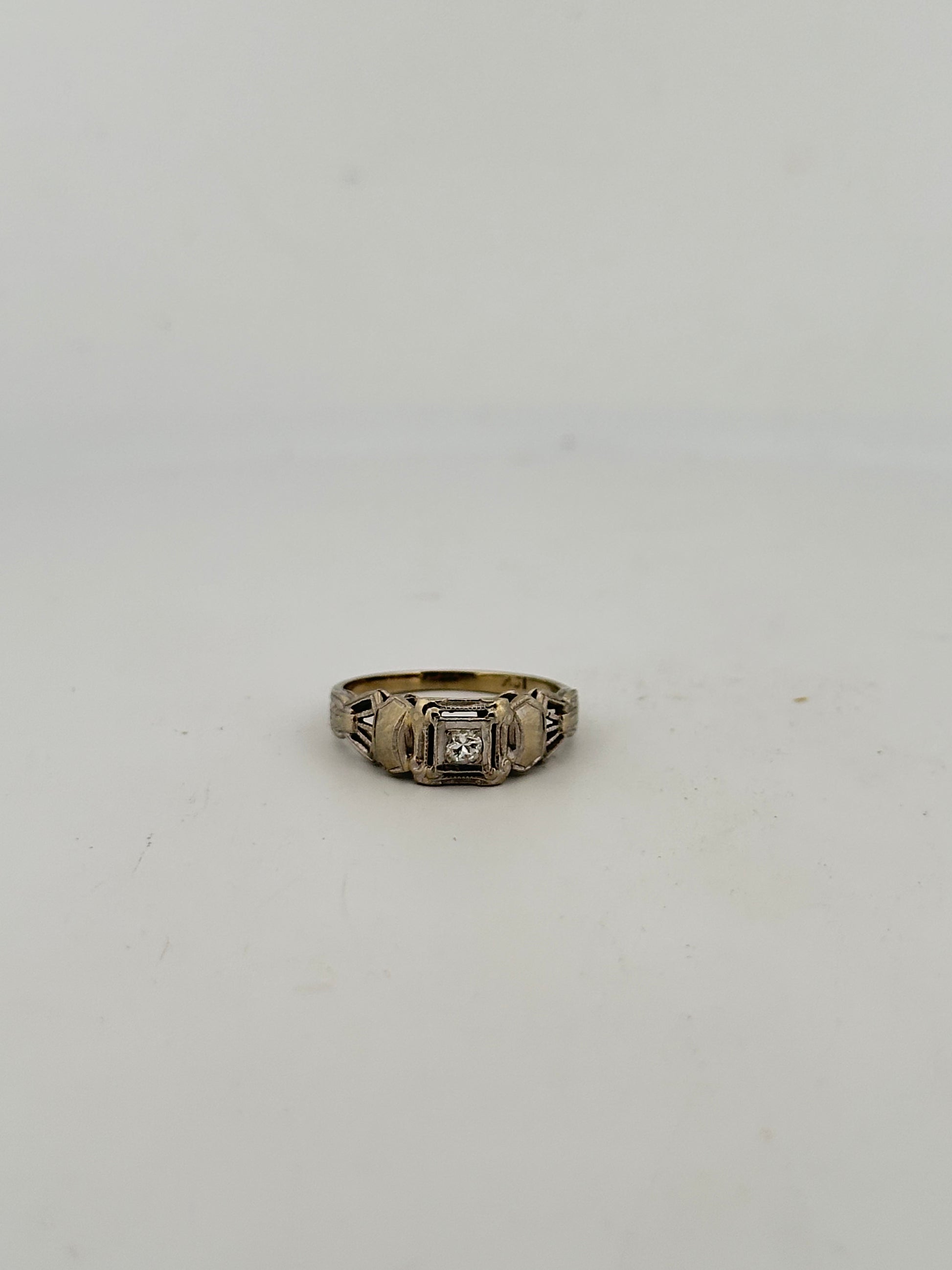 Antique 18k white gold natural antique single cut diamond ring with hand engraved filigree detailing.