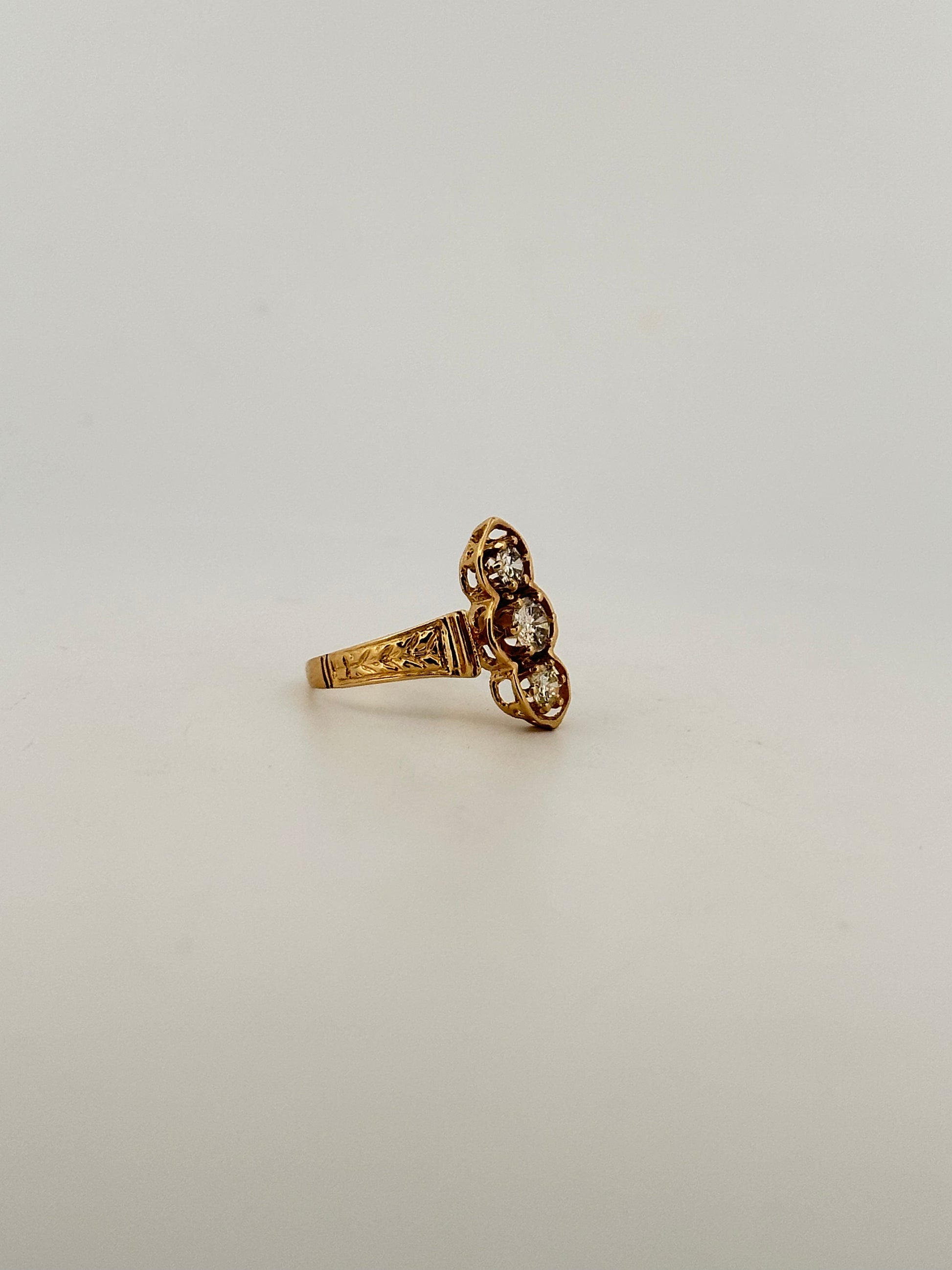 Antique Victorian ring in 14k yellow gold featuring three natural brilliant cut diamonds approximately .80ct total with stunning hand engraved detail.