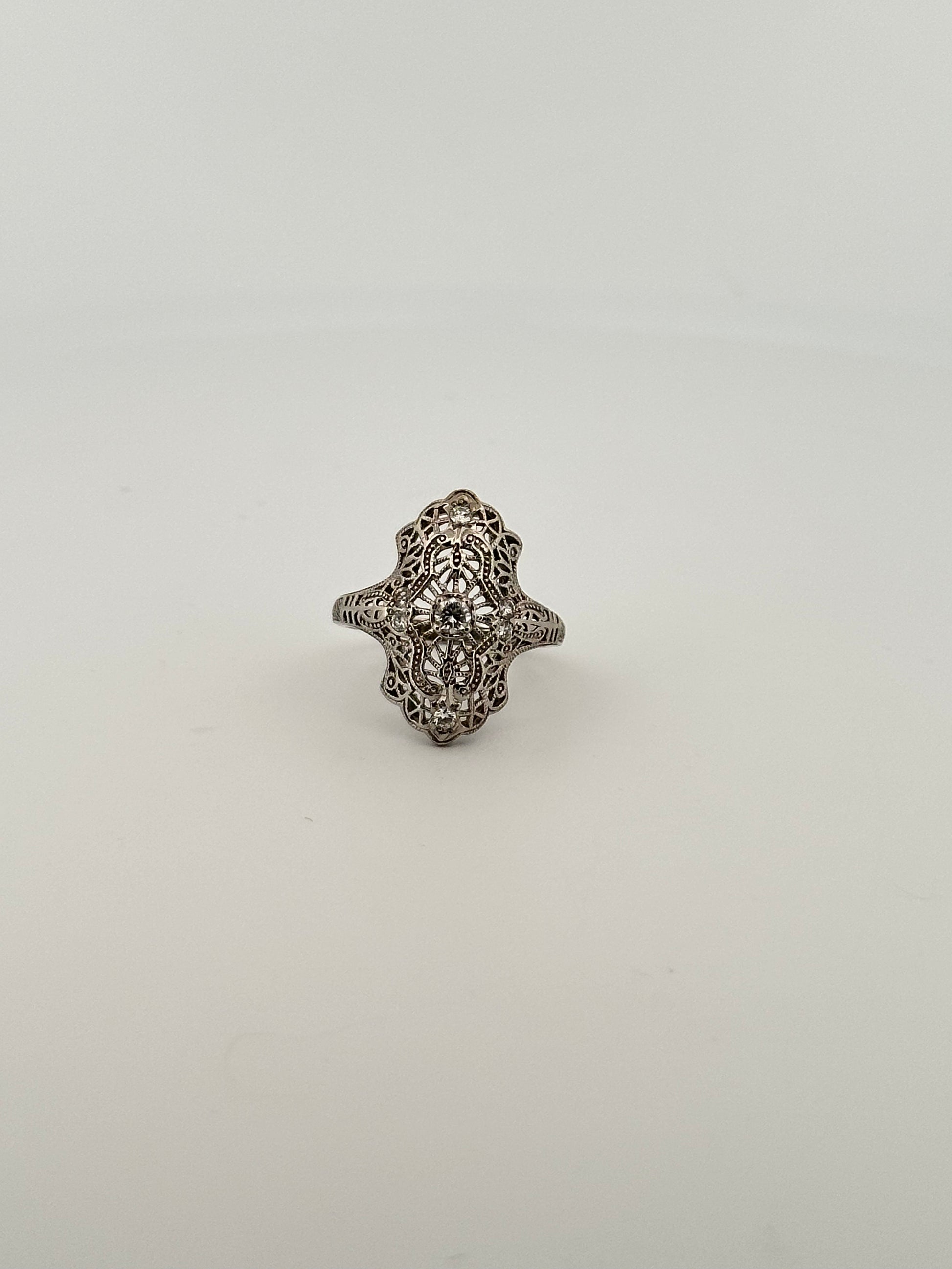 Antique 14k white gold art deco shield ring with 7 natural brilliant cut diamonds approximately .90ct total.