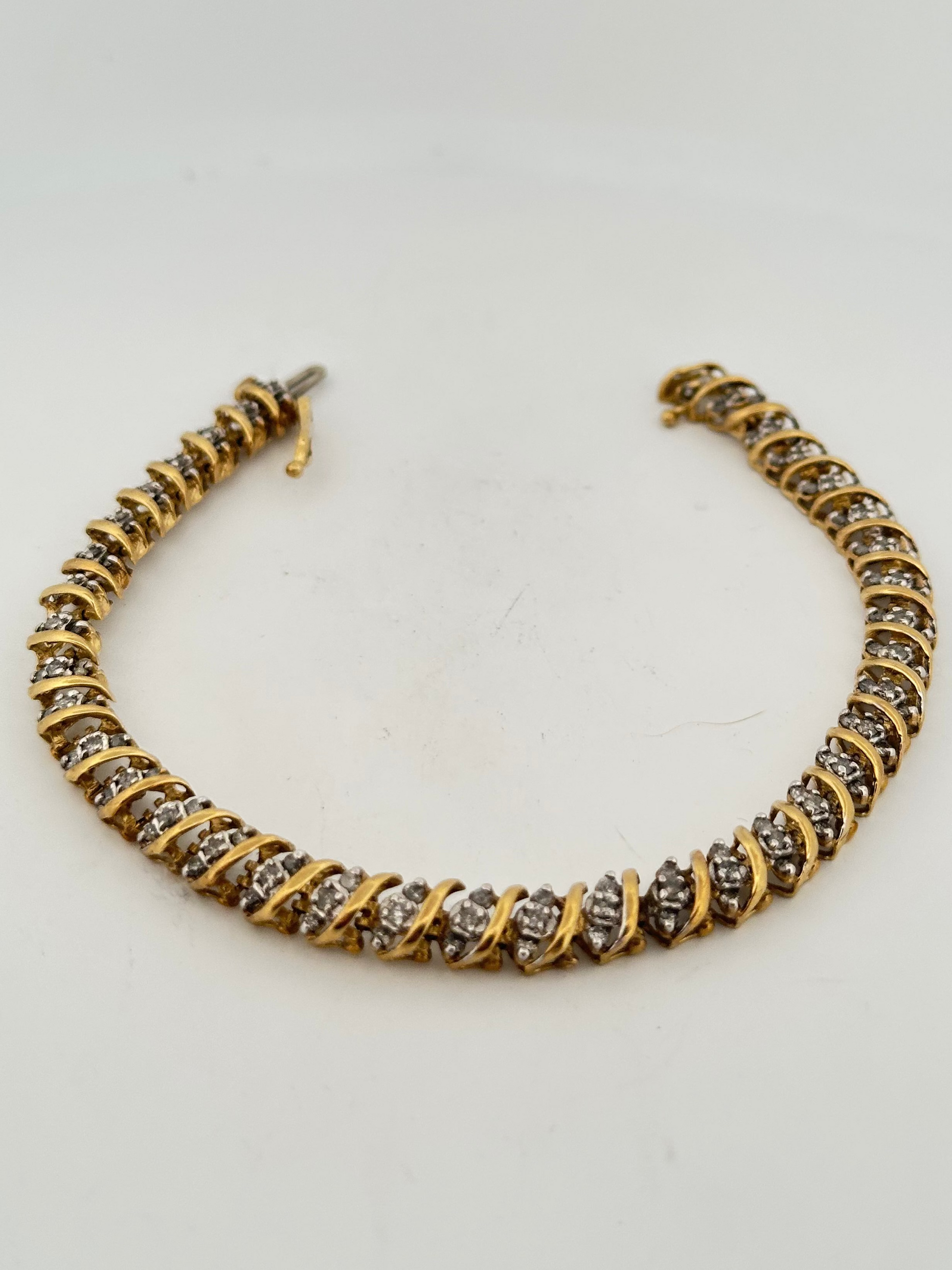 Vintage natural diamond tennis bracelet in 10k yellow gold with white gold setting on each natural brilliant cut diamond segment featuring three diamonds in each link approx .07ct per link. Approximately 2.80ct total
