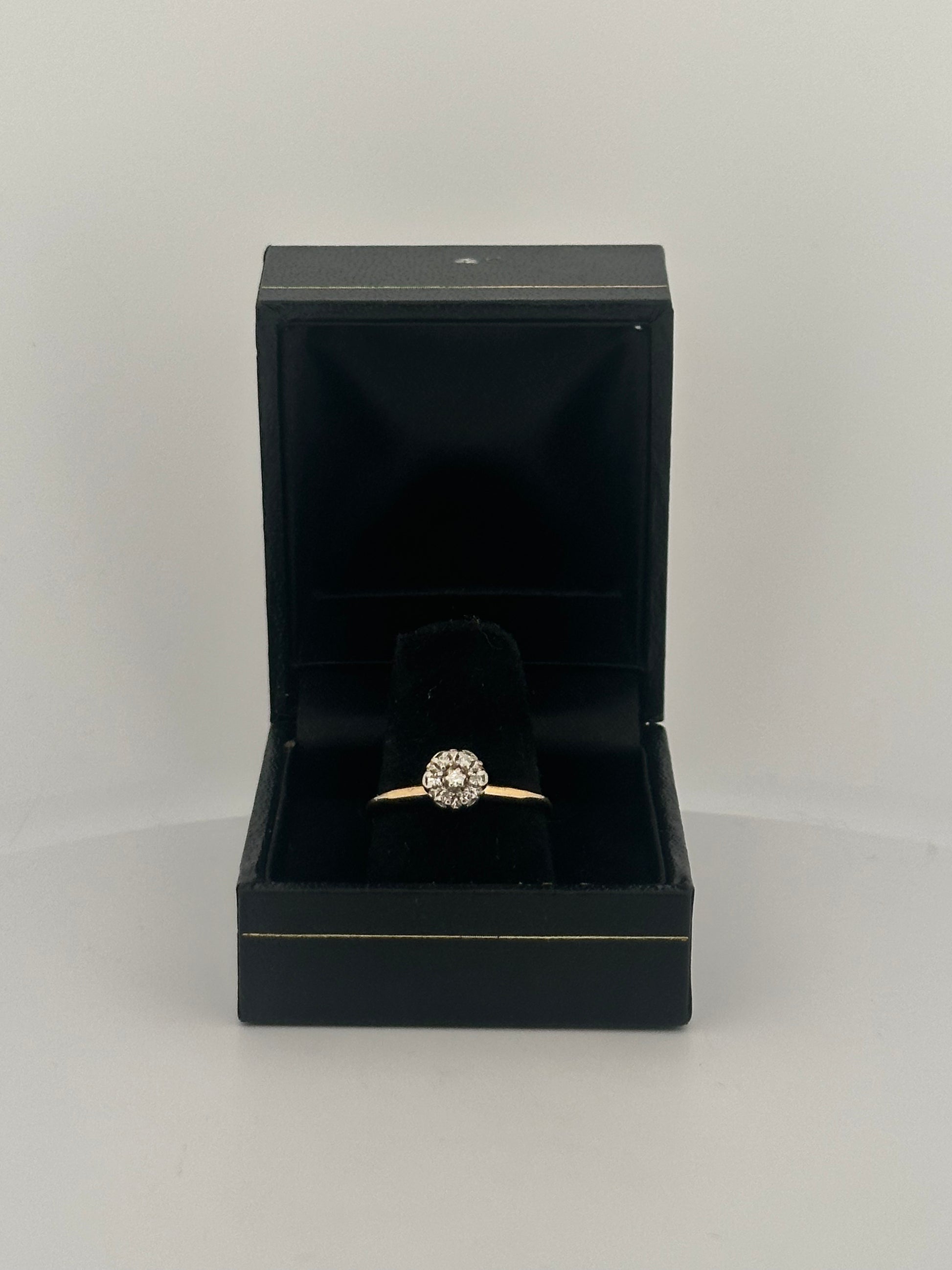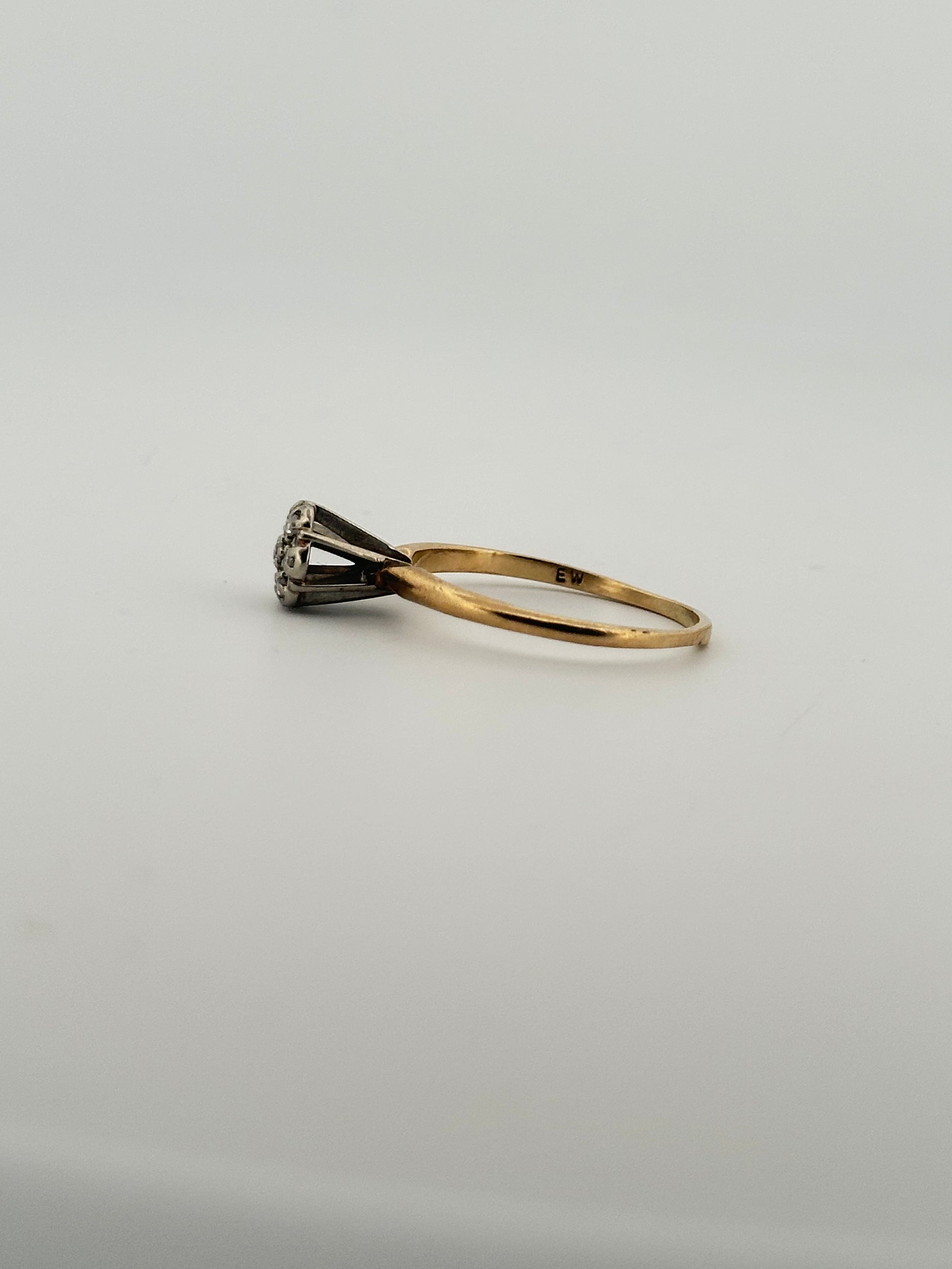 Vintage 10k yellow gold natural diamond floral cluster ring with white gold setting.
